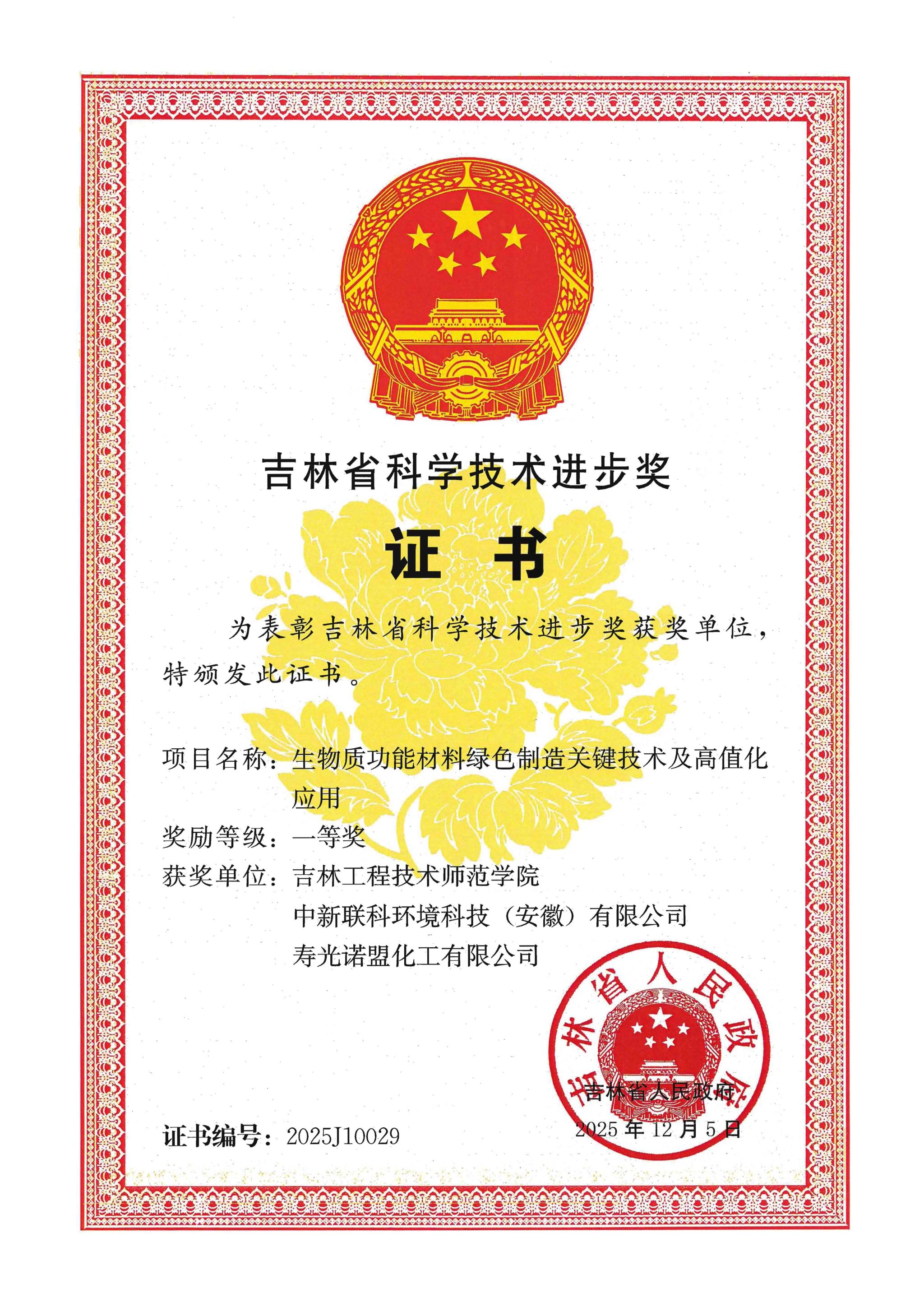2025年12月5日,我校与中新联科环境科技(安徽)有限公司、寿光诺盟化工有限公司联合申报的项目——“生物质功能材料绿色制造关键技术及高值化应用”,获得吉林省科技奖进步一等奖,是我校历史上在该奖项一等奖的首次加冕。